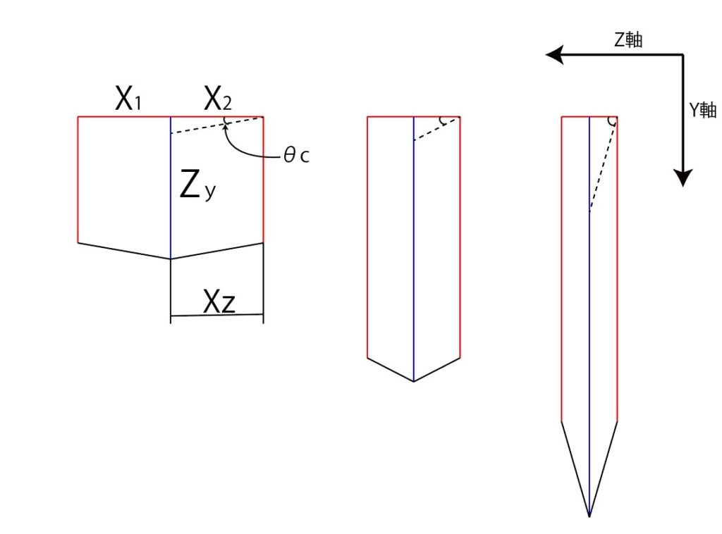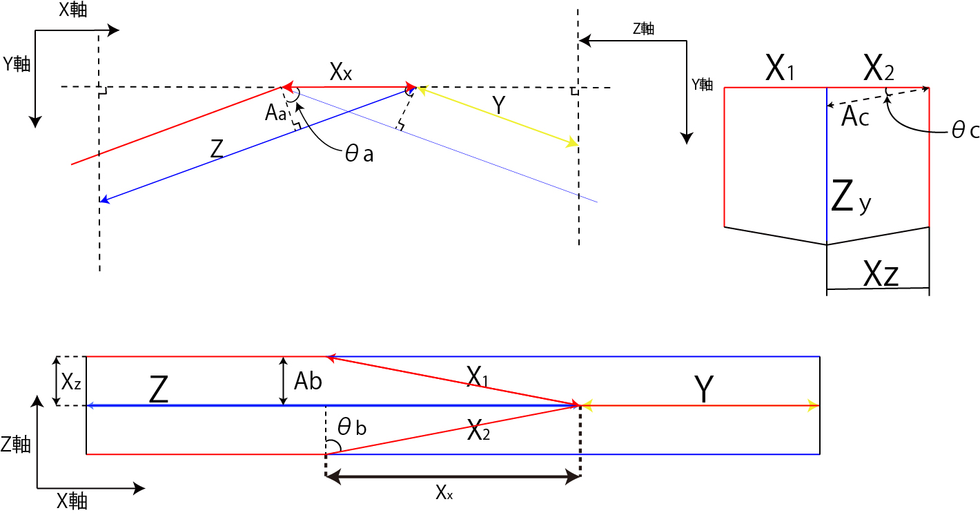 むしろθbのみ概念が異なるのだ。θa、θcは谷折りZから山折りまでの最短距離をもとに作られたθをもとに作られたものであるのに対し、θbはZ方向に平行な線を描きその直線と直線Xの間にできる角である。